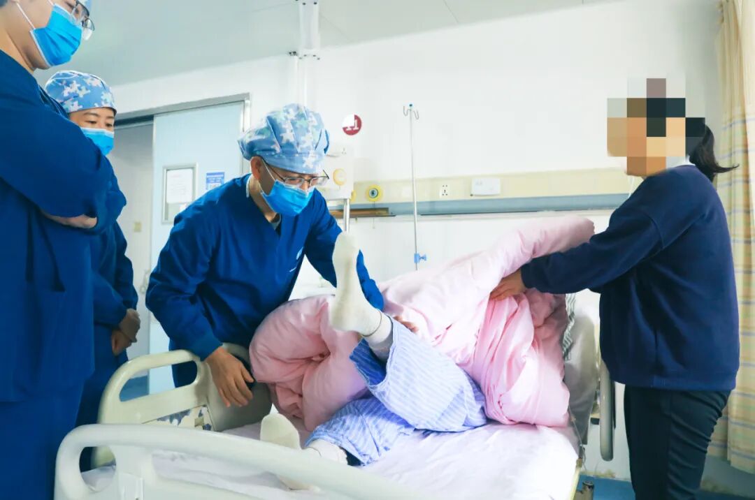 10月22日,神经重症监护病区主任李小磊为丁阿姨查体时,丁阿姨快速抬起曾经患病的腿,高兴地对李主任说,她现在走路已恢复正常!医护人员纷纷为她点赞。
